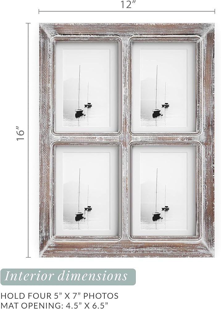Dimensions - Material: Wood farm house picture frame. Material: Wood/Glass. Color: Brown. Overall frame dimensions: 16" x 0.75" x 12". Image size: Comes with matte to fit both 4” x 6” and 5” x 7” photos. Glass: 4.5" x 6.5". Wall Hanging. Vertical and Horizontal hanging.