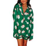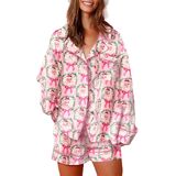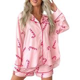 Feature: Satin silk Christmas pajamas, button up pajama set, long sleeve shirt and shorts lounge set, pink Santa Claus pjs, candy cane pj set, printed Xmas pjs sleepwear for women, front pocket blouse, short pants set nightwear.