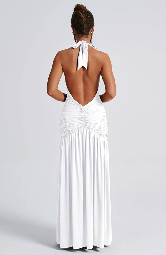 Feature:The maxi dress is complete with a high split and ruched detailing, halter neckline,self tie to the back of the neck and backless,sexy party evening dress.