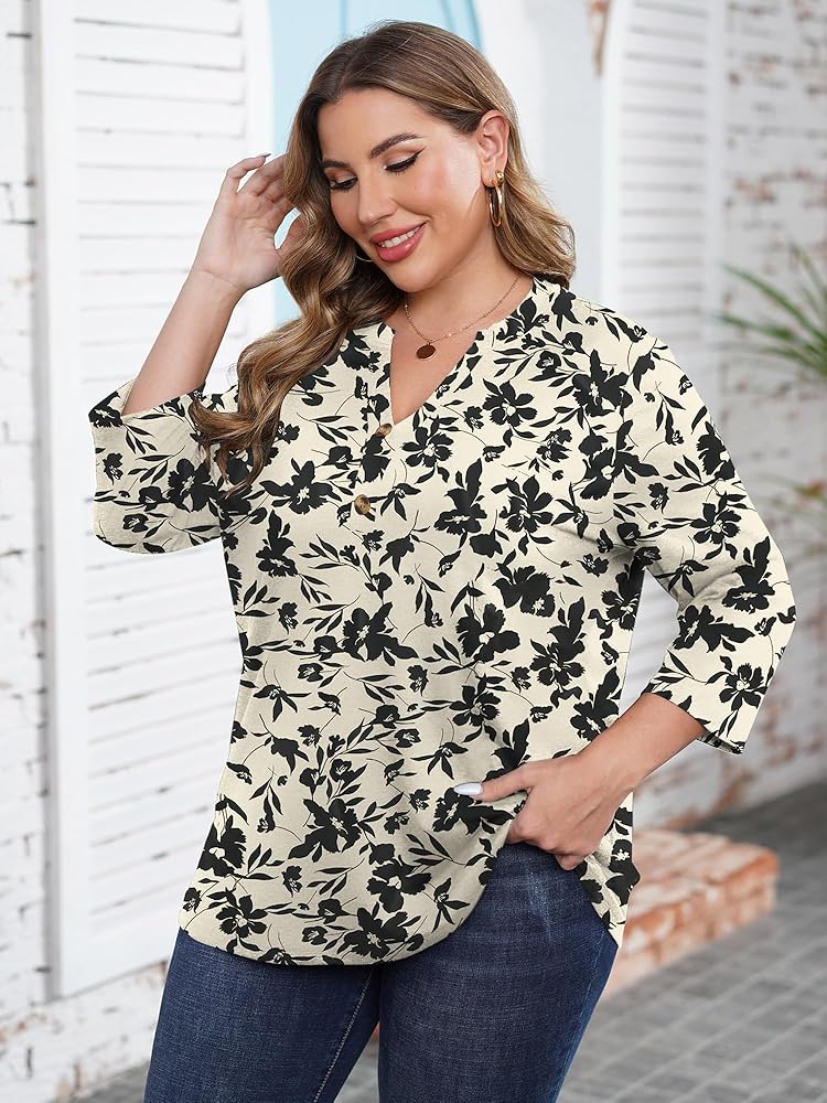 Features: Plus size shirts for women features 3/4 sleeves, button up henley shirts, plus size XL-5XL, sexy v-neck collar to stretch your neckline, curved hem, flowy and loose to cover belly and hips for oversized ladies junior girls or casual wear
