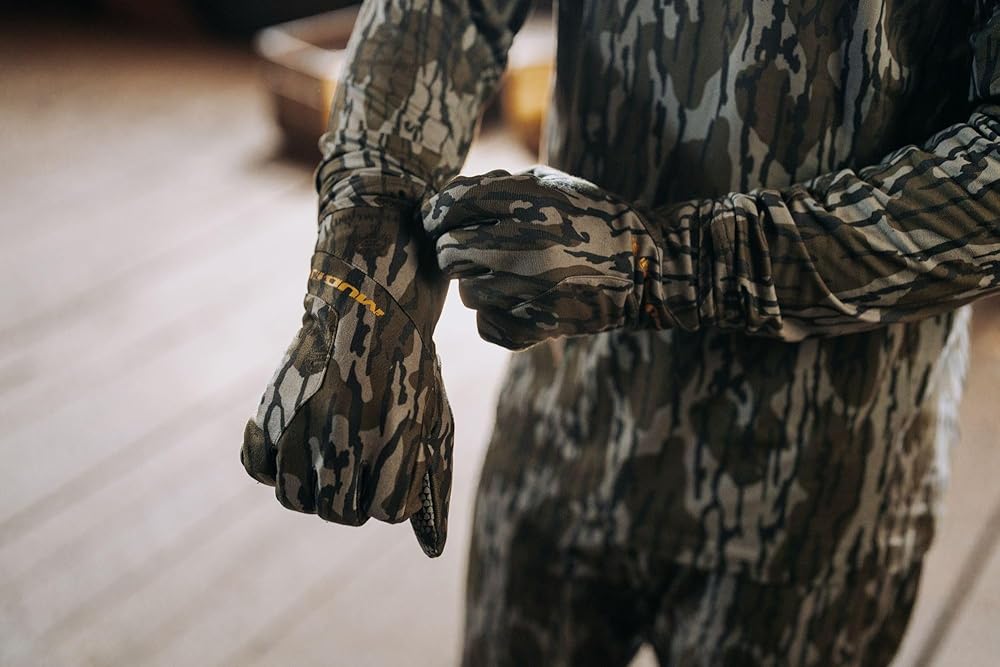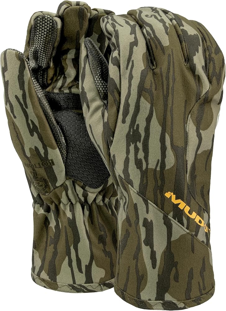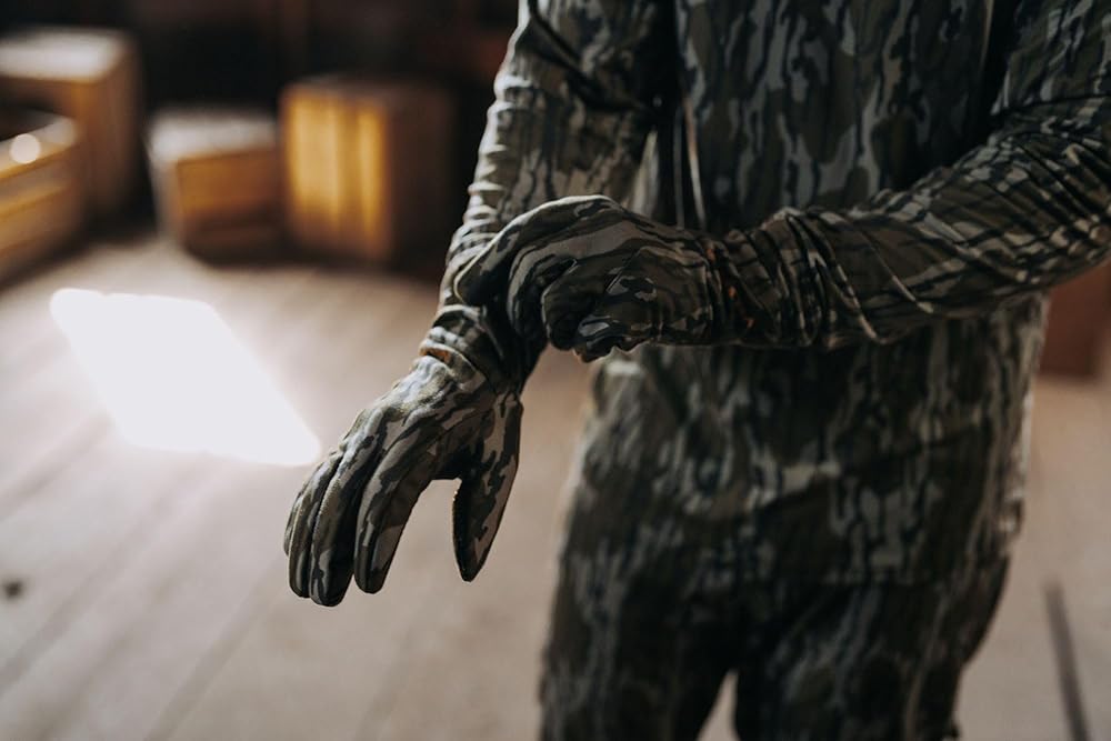 These mid-season gloves feature a brushed tricot outer shell with a TPU laminate for water resistance and silent movement. They're 100% windproof, offering protection from harsh winds, with a midweight fleece lining for warmth in cooler temperatures. The gloves have durable polyurethane palm patches, elasticized wrists for a snug fit, and thin cuffs ideal for bow hunting. The tech touch silicone print on the thumb and index finger allows for mobile device use without removing the gloves. Lined with short fur fleece for extra warmth, they are available in Mossy Oak Bottomlands or Veil Canyon Grey.
