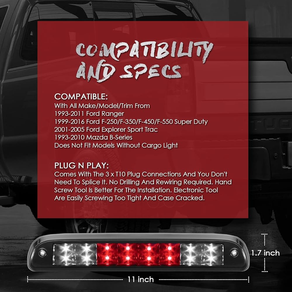 🚗【Third Brake Light Fitments】3rd brake light for 1999 2000 2001 2002 2003 2004 2005 2006 2007 2008 2009 2010 2011 2012 2013 2014 2015 2016 F250 Super Duty third brake light, for 1999-2016 F350 Super Duty 3rd brake light, for 1999 2000 2001 2002 2003 2004 2005 2006 2007 2008 2009 2010 2011 2012 2013 2014 2015 2016 F450 F550 cab brake light, for 1995-2003 Ford Ranger high mount stop light, for 2001-2005 Ford Explorer Sport Trac cargo light, for 1994-2010 Mazda B2300/ B4000 rear brake tail lights, for 1994-2008 Mazda B3000 led third brake light.replace OEM #CC3Z-13A613-A,CC3Z13A613A, YC3Z-13A613-BA, YC3Z13A613BA.