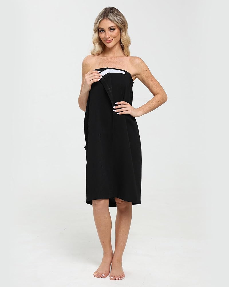 Easy Snap Closure: Our towel wraps feature a secure snap closure that makes them easy to put on and take off, providing a tailored fit and ensuring your wrap stays in place.