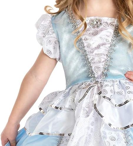 Our classic Cinderella princess dress features a stretchy blue velvet bodice that is elegantly detailed with a gathered white inlay, sparkling silver trim and a beaded flower. The silver trimmed hip drapes capture that authentic Cinderella look.