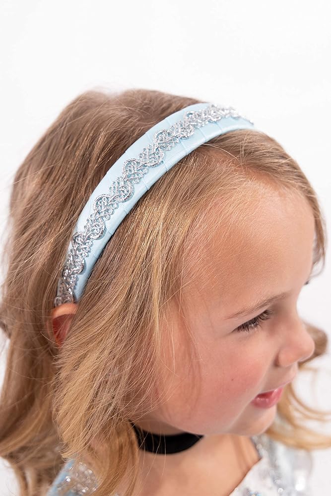 Our classic Cinderella princess dress features a stretchy blue velvet bodice that is elegantly detailed with a gathered white inlay, sparkling silver trim and a beaded flower. The silver trimmed hip drapes capture that authentic Cinderella look. Your little princess will enjoy hours of imaginative play as they transport themselves into a make believe world of magic and adventure with their new Cinderella headband, pendant choker necklace, and glove set! These gorgeous headbands/crowns and gloves are the perfect addition to their princess dress outfits. The elbow length gloves are fabulous accessories to any of our beautiful princess dress ups. They also work well for parties, weddings or special occasions.