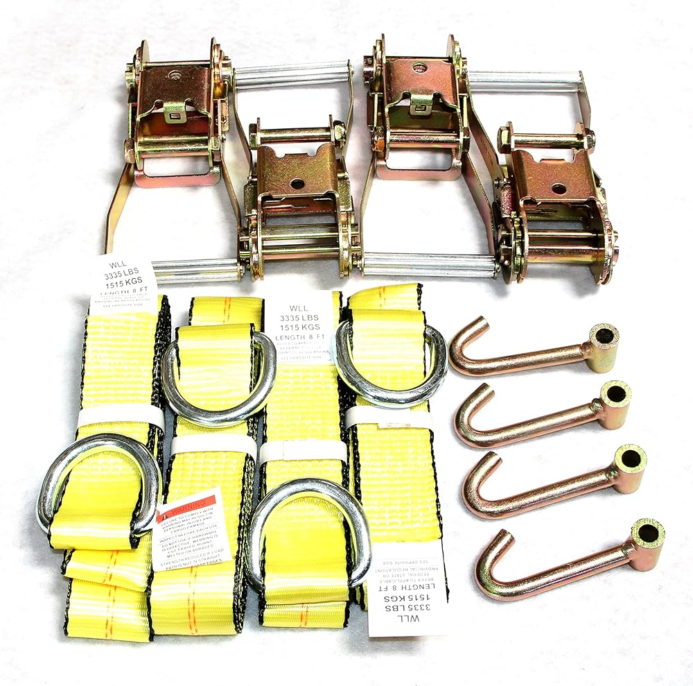 - Our Lasso Strap, attached with D ring on one end comes with Black Edged and its rated Heavy Duty Strength. Polyester webbing that is treated for UV, abrasion resistance and will not stretch over time. D ring is Zinc Plated for weather protection. The complete strap has a 10,000lbs assembly breaking strength and rated at 3,335lbs Working Load Limit. - Extra Long Aluminum Handled 2" ratchet with an 11,000lb breaking strength. Ratchet comes with Zinc Plated for weather protection. Extra long handle is perfect for jobs where you need leverage to secure the load when you need it. - 2" Finger J hook with 1/2' Diameter is Zinc Plated for weather protection. Hook has a 6,600 breaking strength and a 2,200 Working Load Limit. Hook will not be mounted when shipped due to hook up/hook up application varies upon application. Note: Never use as lifting application and Do Not exceed working load limit.