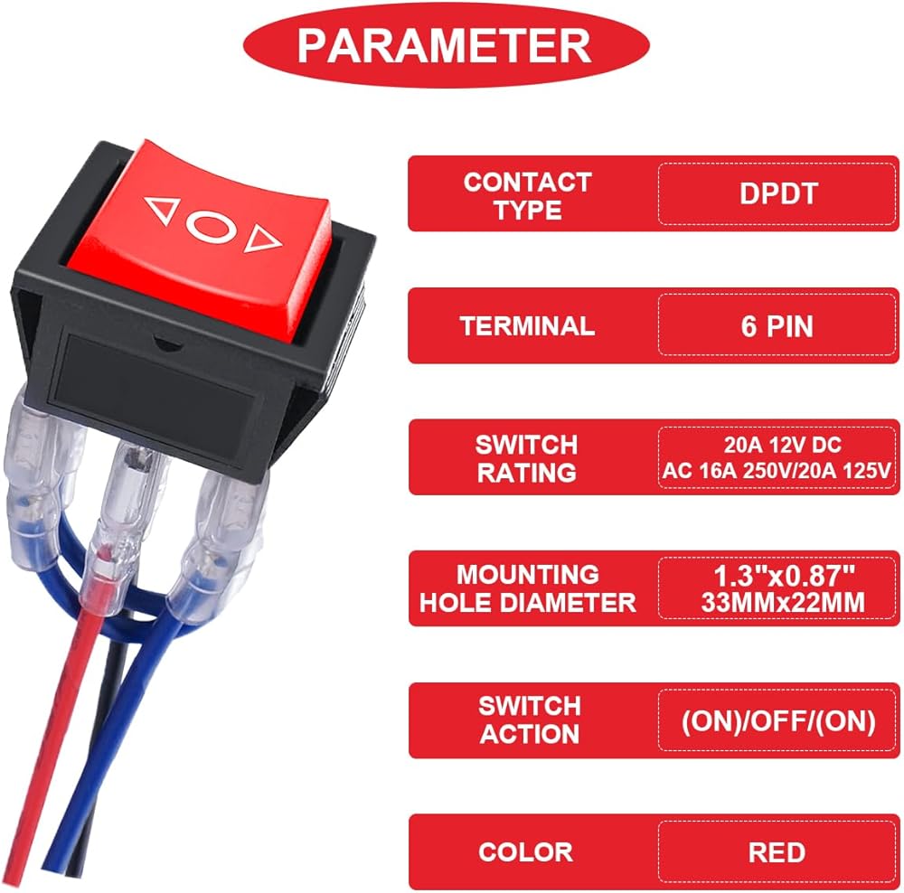 SPECIFICATIONS:Rated Voltage And Current:DC 12V 20A/16A 250V AC/20A 125V AC;Positions:(ON)-Off-(ON);Pin Quantity: 6;Contact Type : DPDT;Mounting Type:Panel Mount;Mounting Hole Diameter: 33mmx22mm/1.3''x0.87'';Wire Gauge:UL1007 18AWG;Cable Length: 100mm/3.93inch;Material: Plastic, Metal;Color:Black.