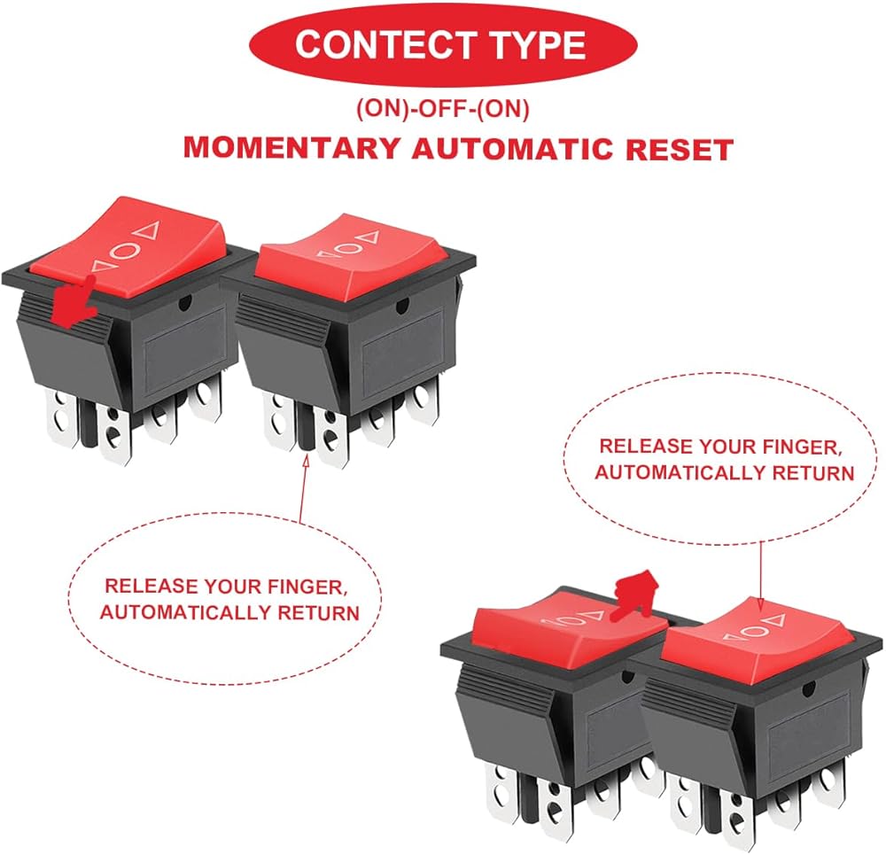 MOMENTARY SWITCH:6Pin DPDT momentary (ON)-Off-(ON) switch, is momentary Automatic Reset action, Resetting returns to off when released.