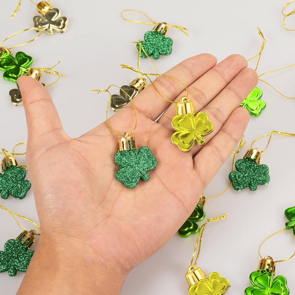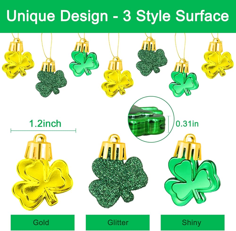 What You Get: One St. Patrick's Day Shamrocks Ornament Set including 30pcs green clover baubles in 3 style, just like the main picture shown