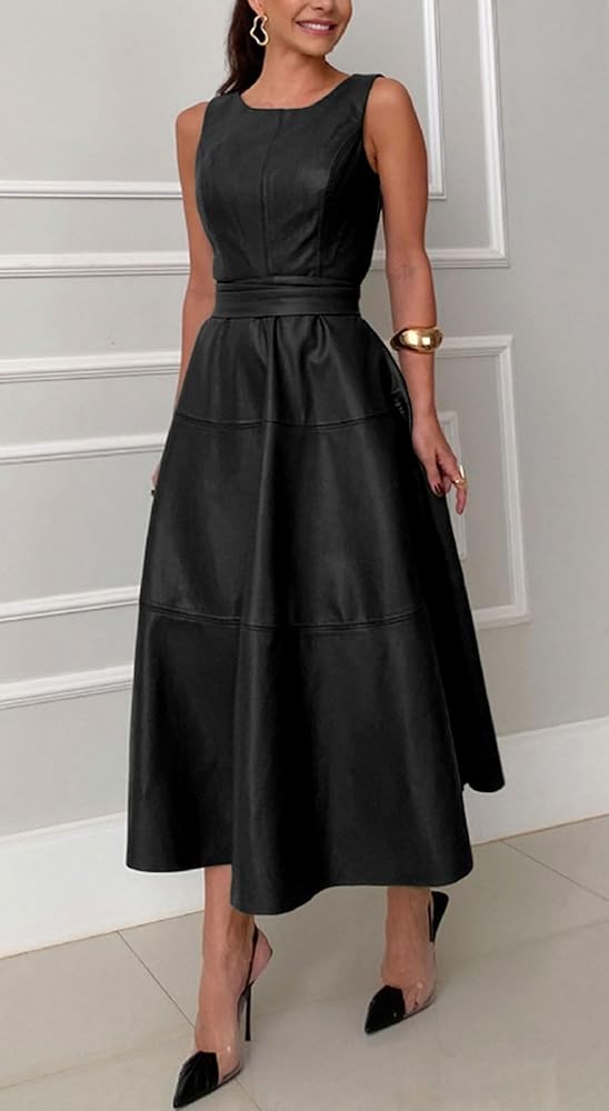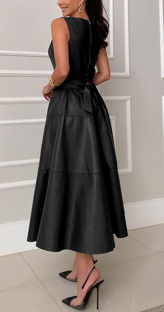 Highlights: Faux leather long dress, PU leather dress create a sense of feminine; Sleeveless tank leather long dress, suitable for professional office work; Long leather dress with belt, elegant party dress outfits