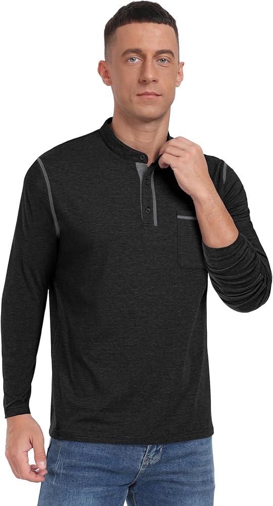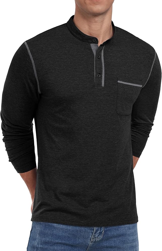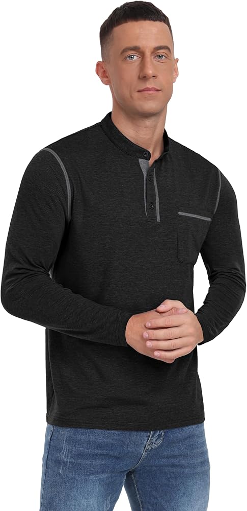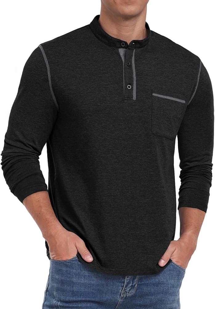 【CLASSIC DESIGN】The basic henley tee shirt for men featuring 3-button placket closure, pocket front, long sleeves, regular fit, solid color, durable stitching. Classic and timeless design.