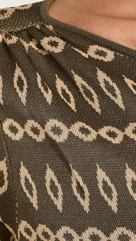 - Geometric pattern, Gathered shoulder seams, Wrap silhouette bodice