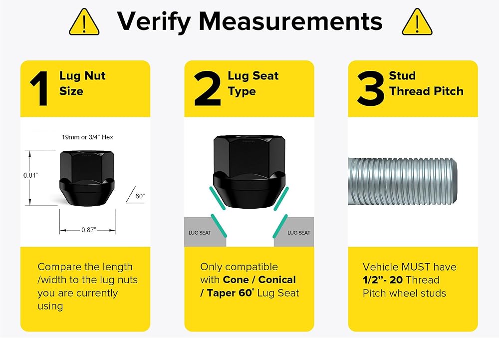 [Safety and Installation] Wheel hardware is an important safety component. Ensure these lugnuts are the proper size (length & width) before installing. Failure to install correct hardware is unsafe and may cause wheel/tire assembly to loosen or fall off while vehicle is in motion. Torque wrench is required for a safe installation. You'll also need a 19mm (3/4") Hex Socket Key Tool.