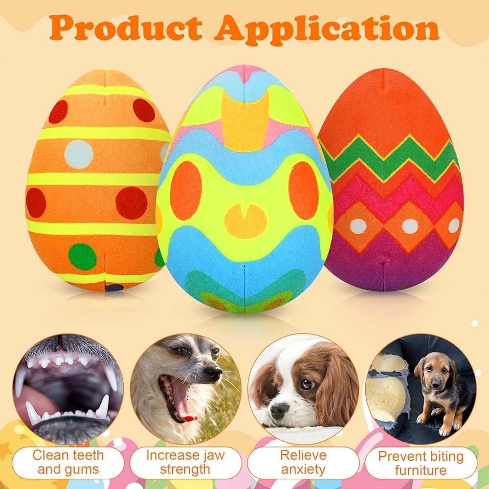 🥚【Size and Application】The size of funny dog toy is 3.5*2*5.3 inches. This squeaky dog toy is composed of three colored eggs. One egg is dirty, and the other two can be replaced. It is the perfect gift for dogs on Easter, birthday or other occasions.