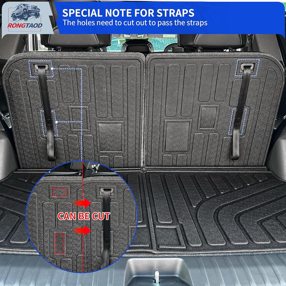 Convenient Installation: No other tools need. Our back seat cover protector has Velcro on the back, which can be firmly fix the mat on the back of seat. Please note that if the 3rd row seats of your EV9 are manually folded down, the reserved holes on the left and right of the mat need to be cut by yourself to allow the straps to pass through the holes.