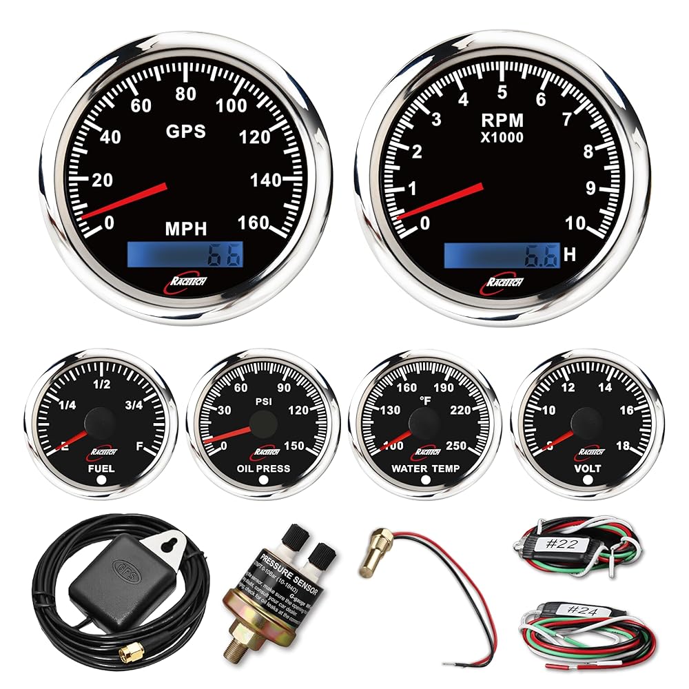 RaceTech 6 Gauge Set Features 6 Most Essential Gauges For Any Boat or Car's Instrument Cluster - Includes GPS Function Speedometer & Tachometer - Fuel Level, Oil Pressure, Water Temperature & Volt Gauge.