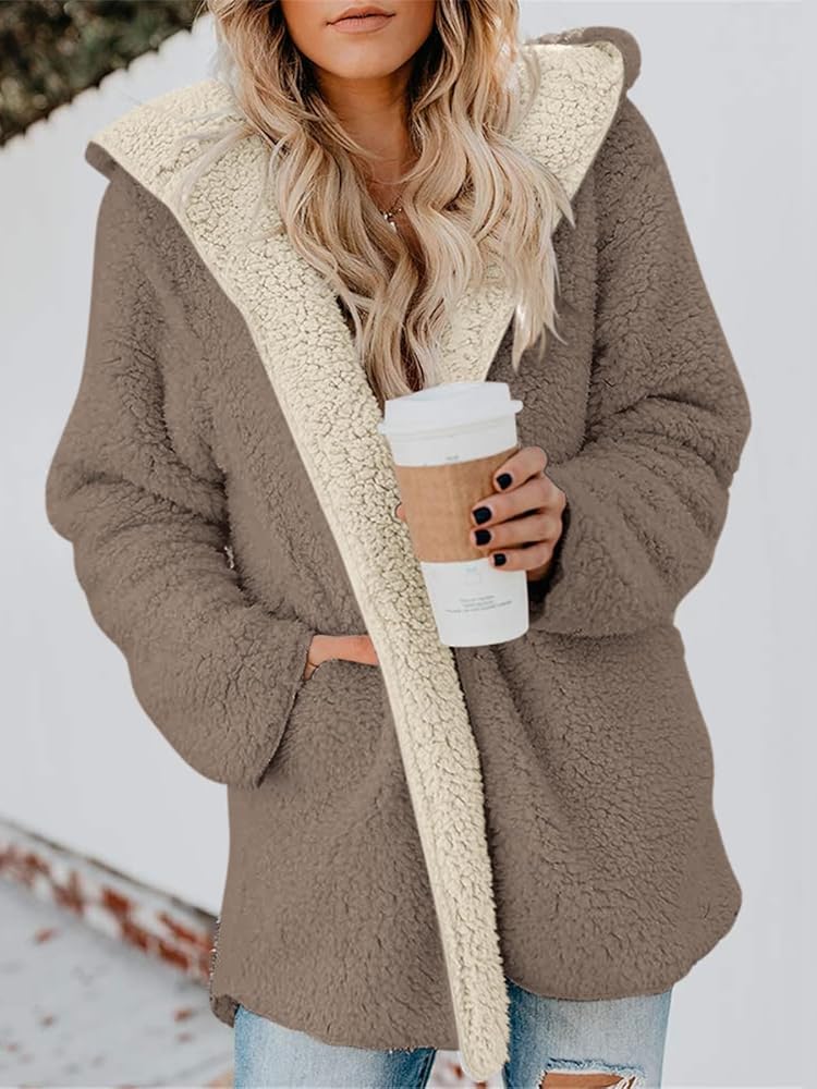 Eyecatching look: Sherpa cardigan women, open front hooded fluffy cardigan, long sleeve, man-made puffy fleece fur, side pockets, oversized, boyfriend style, fluffy jacket, makes this fashion cozy fit fuzzy sherpa cardigan sherpa jacket coat chic and warm