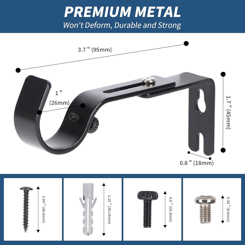 ADJUSTABLE & VERSATILE: The adjustable curtain hooks for wall support a maximum rod diameter of 1 inch, making them compatible with any standard rod of the same size. They are widely suitable for various indoor environments. The adjustment range extends from 3.7 to 4.8 inches away from the wall