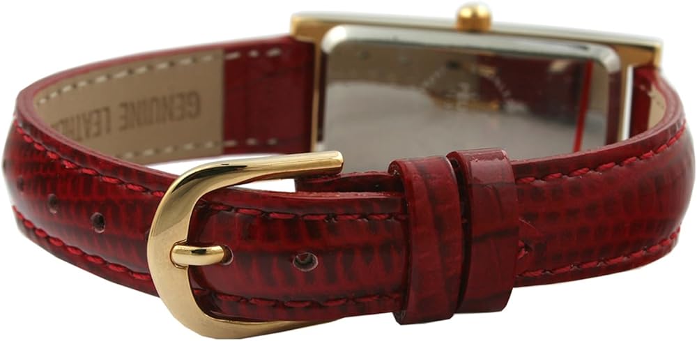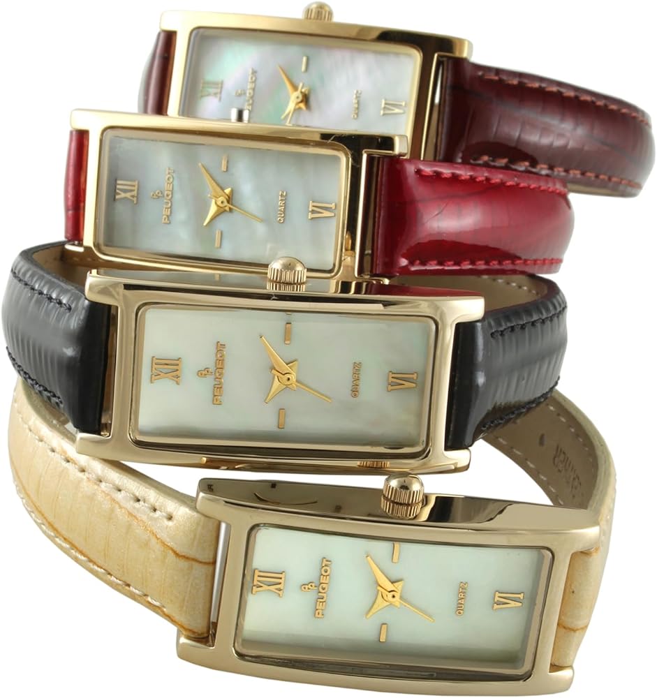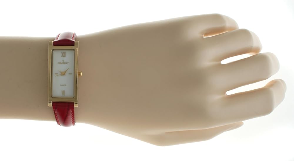 The slender style of the Peugeot Women's Gold-Tone Brown Leather Strap Watch is accentuated by the narrow rectangular case and thin strap. The polished gold-tone brass case and bezel complement the glistening mother-of-pearl dial. Gold-tone Roman numerals mark the 12 and six o'clock positions and gold-tone indices mark the three and nine o'clock positions. Petite angled gold-tone hour, minute, and second hands suit the small design complementing its slender style. A genuine brown pigskin leather strap adjusts to fit comfortably and fastens with a secure buckle clasp. A durable mineral crystal protects the dial of this timepiece. This watch features reliable Japanese quartz movement, is water resistant to a depth of 99 feet (30 meters), and comes with a free lifetime battery replacement from Peugeot.