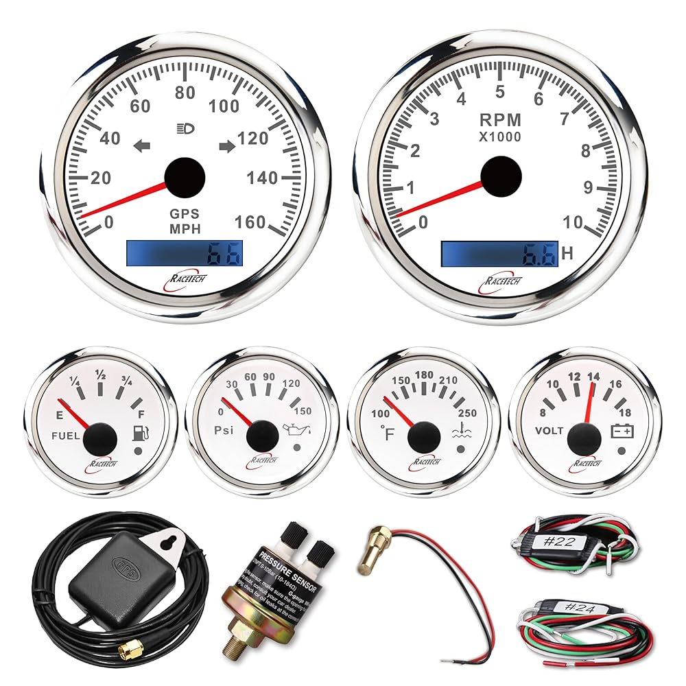 RaceTech 6 Gauge Set Features 6 Most Essential Gauges For Any Boat or Car's Instrument Cluster - Includes GPS Function Speedometer & Tachometer - Volt, Fuel Level, Water Temperature & Oil Pressure Gauge.