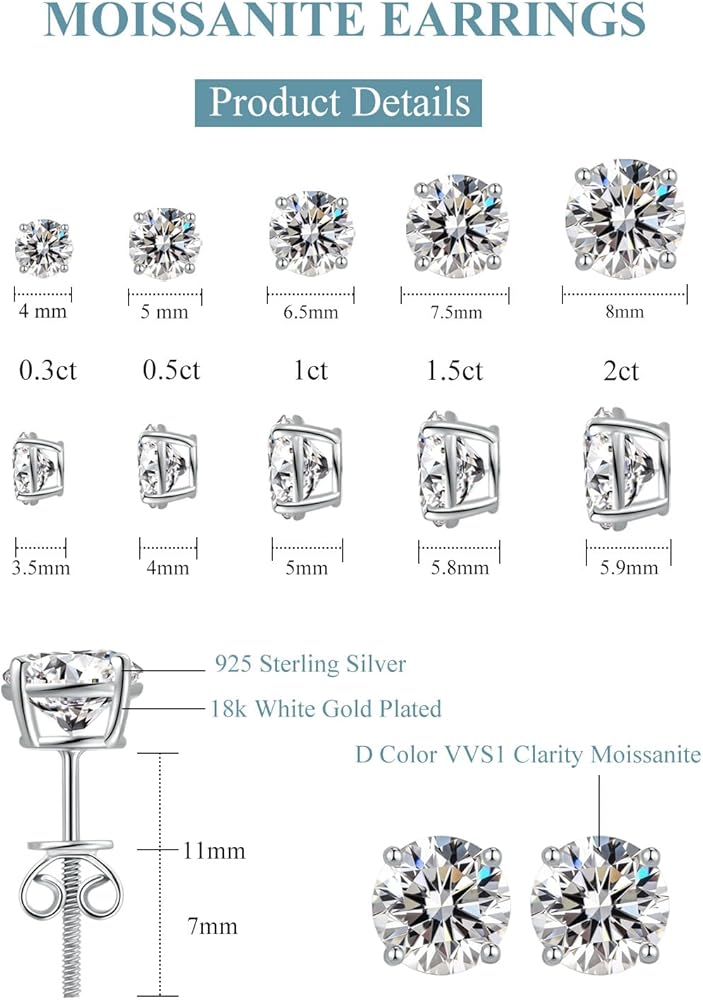 Find Your Perfect Size: The moissanite stud earrings offer five sizes to suit your style! Choose from 0.6 CT (0.3 ct each) / 4 MM, 1.0 CT (0.5 ct each) / 5 MM, 2.0 CT (1.0 ct each) / 6.5 MM, 3.0 CT (1.5 ct each) / 7.5 MM, and 4.0 CT (2.0 ct each) / 8 MM. Select the size that best matches your preference!
