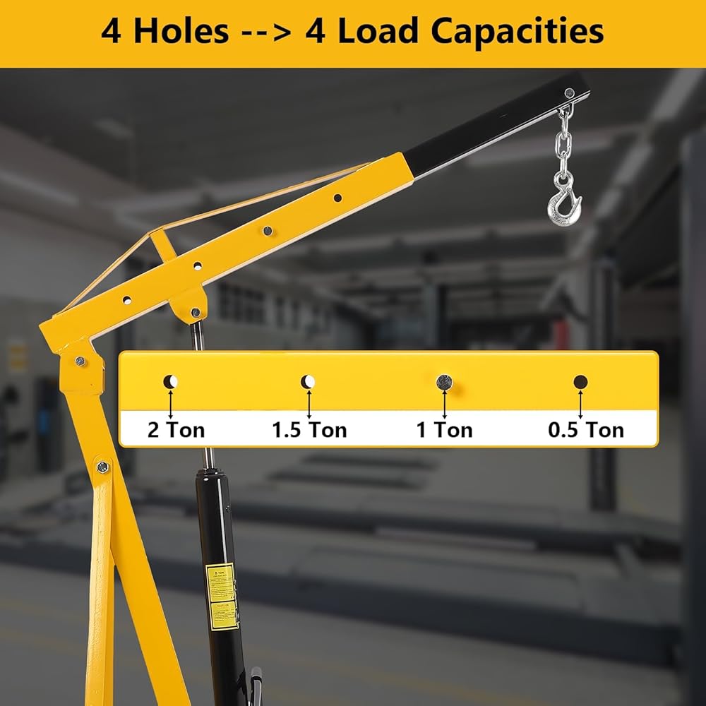 Weight Adjustable & Folding Design: This crane offers four adjustable boom positions to accommodate your various lifting requirements with capacities of 0.5 Ton, 1 T, 1.5T and 2 Ton, lasting ram hydraulic cylinder. The extension arm and stand fold easily for convenient storage