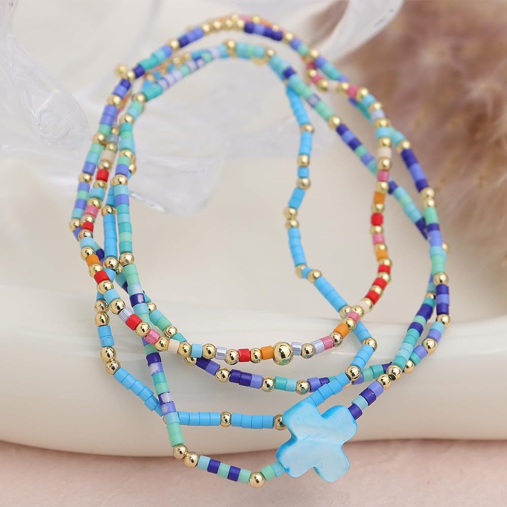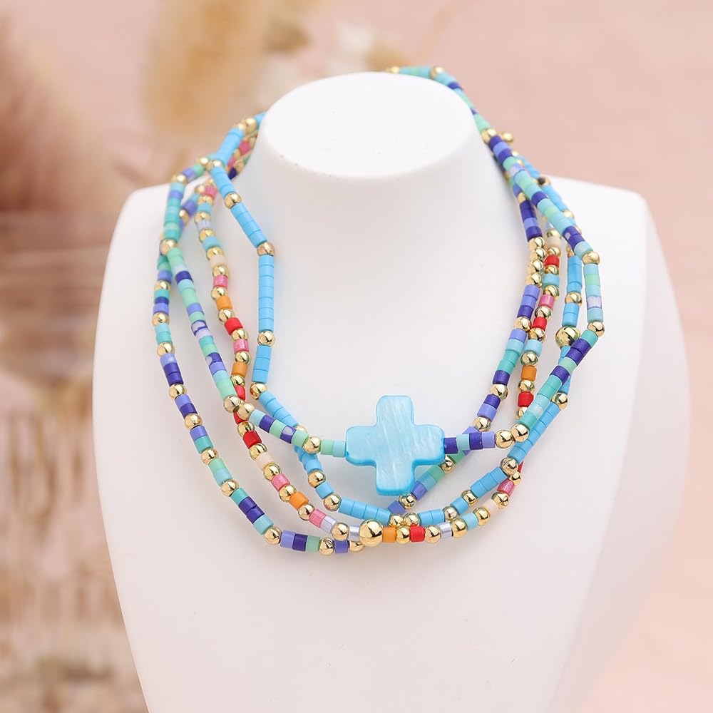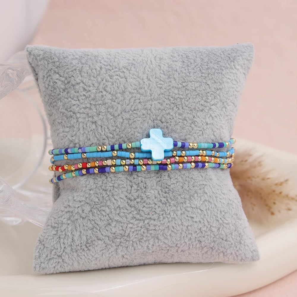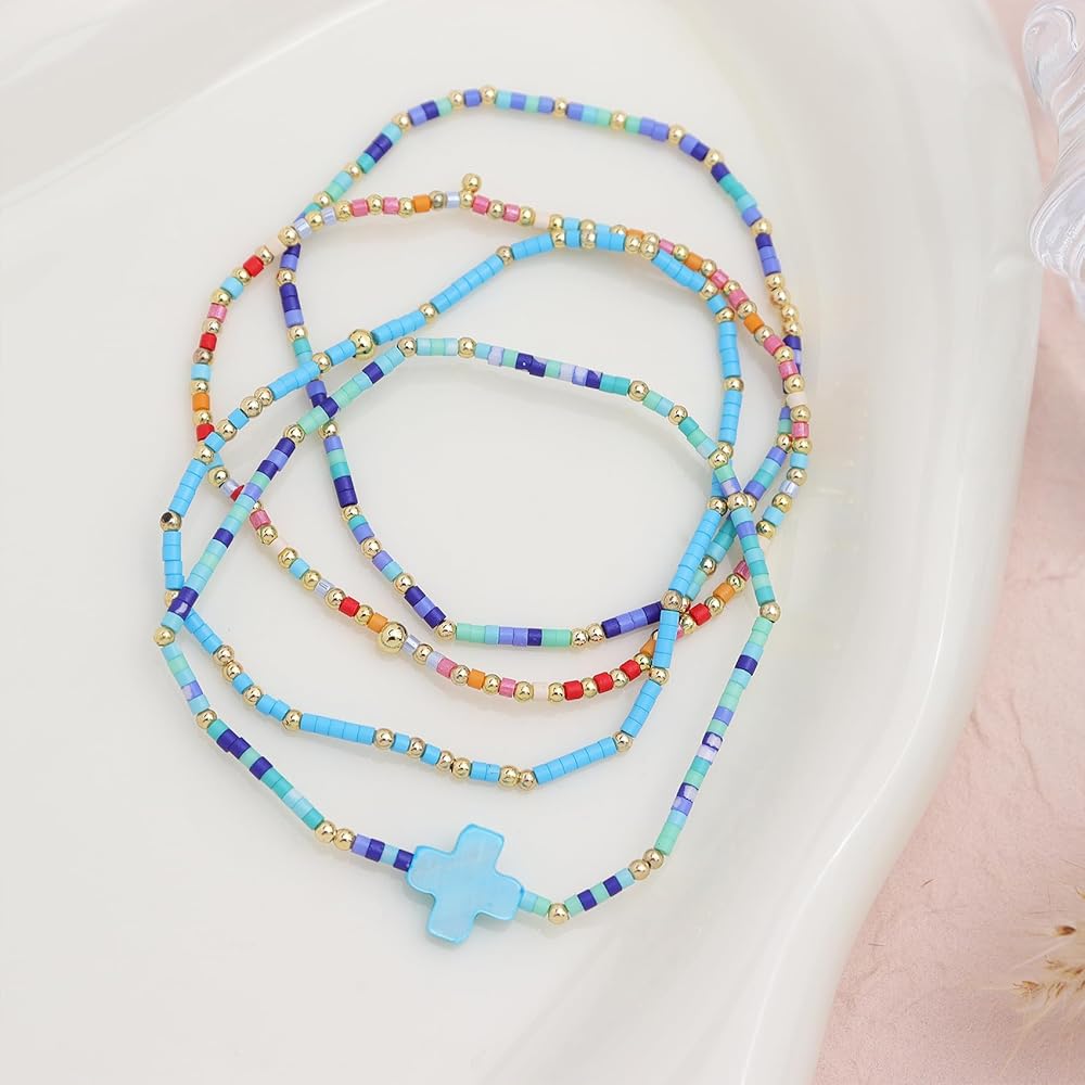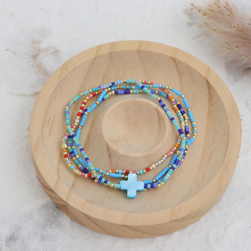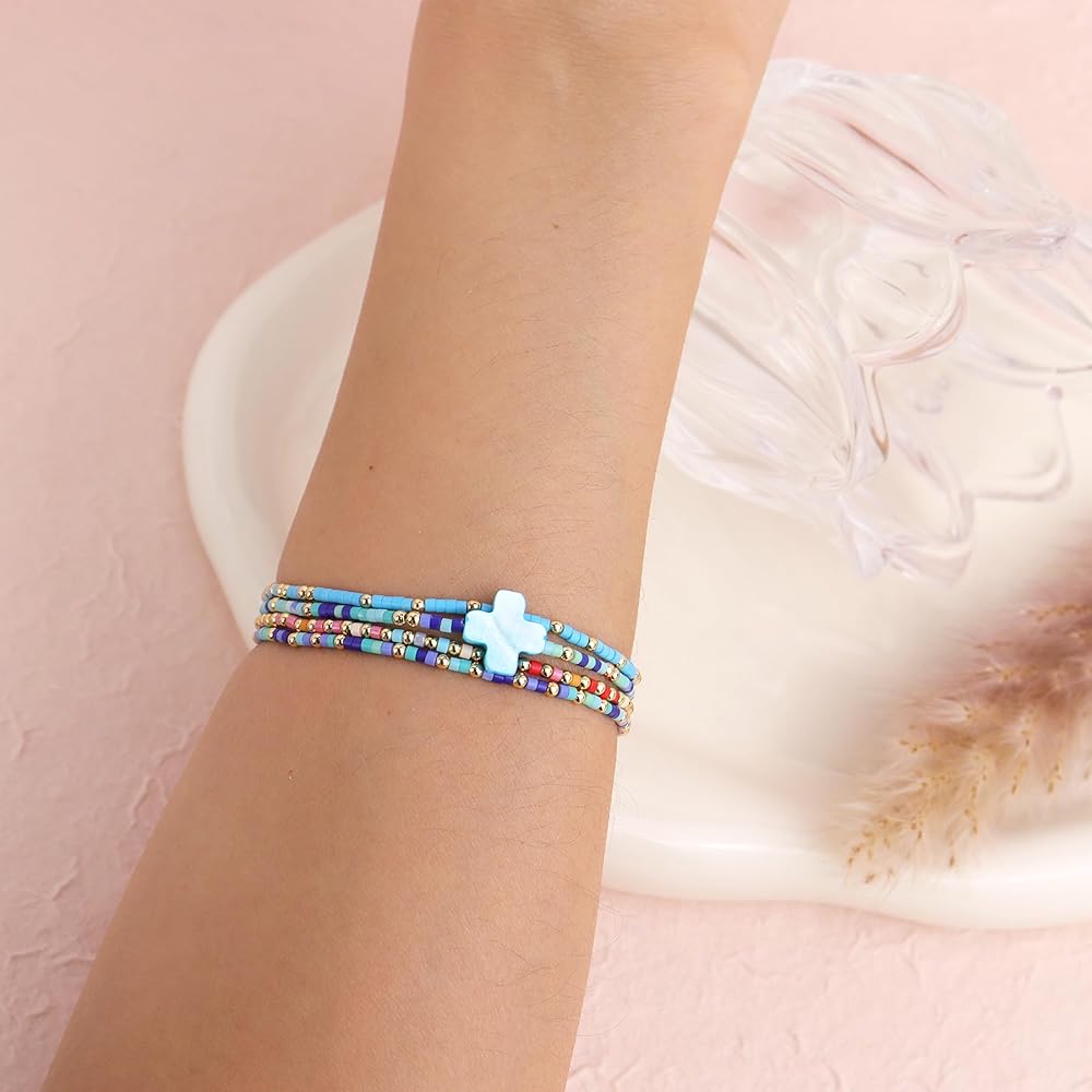 • Dainty 4pcs stackable handmade beaded bracelets, includes four bracelets, with trendy statement colorful cross, cool elastic string, suitable for most occasions, carrying blessings and joy in your daily life.