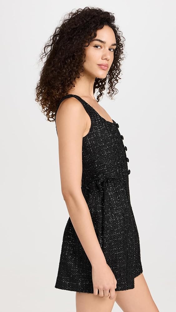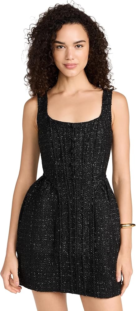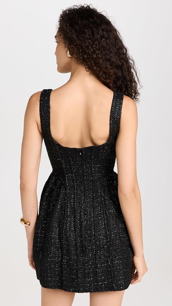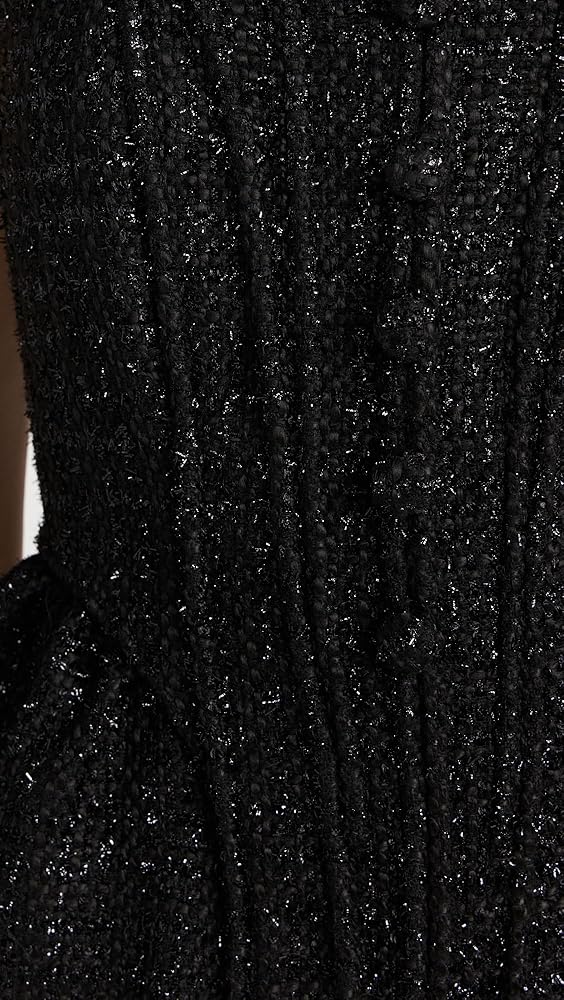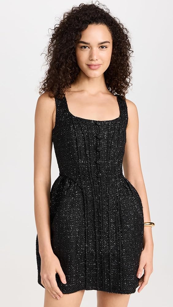 Runs small; please size up, A-line dress has a fitted bodice and a skirt with an exaggerated hip shape. Non-stretch boucle fabric is textured. Fashion tape is recommended to secure the shoulder straps.