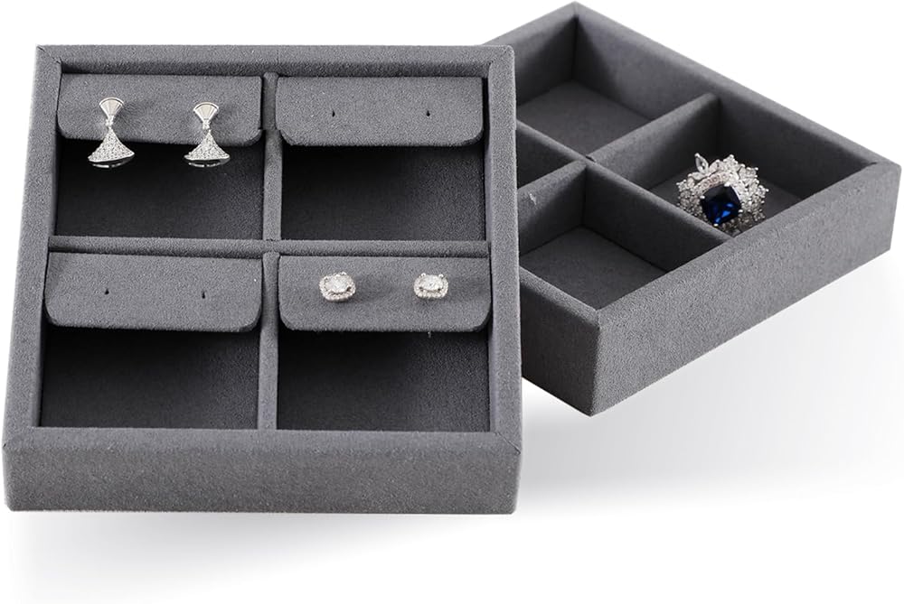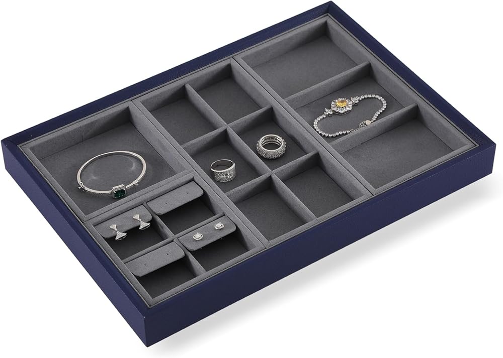 Specification: Jewelry Display Tray Color: dark blue Material: pu leather+velvet The weight and size are as shown Features: 🎈Made with high-quality PU leather and a soft velvet interior, this organizer exudes luxury and elegance. The dark blue color adds a touch of sophistication that matched at will with any room decor. 🎈This multi-functional storage case provides ample space for your rings, necklaces, earrings, and bangles in an organized manner. The display tray keeps your jewelry showcase ready, and the organizer tray can be easily removed, making it easy to find what you need. 🎈The multi-functional design allows you to mix and match your jewelry according to your style and preference. It is the perfect solution for organizing all kinds of jewelry items like rings, necklaces, earrings, and bangles. e 🎈This elegant jewelry organizer is perfect for those who demand high-quality craftsmanship and attention to detail. It protects your jewelry from dust, scratches, and tarnish, keeping them in pristine condition for years to come. 🎈With its sturdy construction and elegant style, this organizer is an excellent gift for any jewelry lover. Package: 1 Piece Jewelry Display Tray, Jewelry Not Included