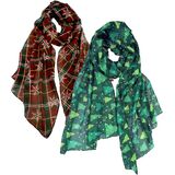 Scarf with Christmas Print - Merry Christmas! The 2-Pack and gift-wrapped Xmas scarves are trendy print scarves with a Christmas design in multiple color options: Christmas trees, reindeer, Santa Claus, snowflake, moose, ginger cookies, Christmas wreath, candy cane, Christmas ornaments, Santa boots, bell, poinsettia, snowman, and buffalo check