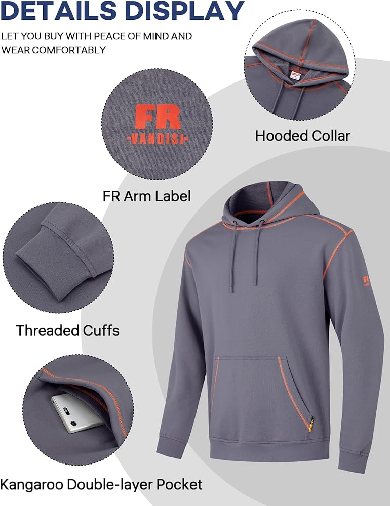 🔥Multi Functionality: Our FR hoodie for men often features multiple functional design elements to meet different work environments and requirements. This hoodie is a double-layer pocket design, which is convenient and safe. The hood with drawstring is well sewn. The hat rope is also a flame-retardant material, which protects the safety of workers in an all-round way. In addition, the cuffs and hem are threaded, which is not only convenient to wear, but also wear-resistant and durable.