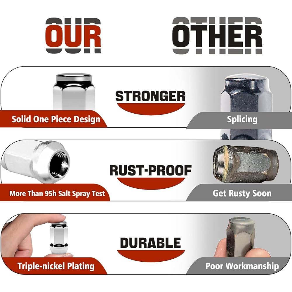 1 year Warranty. golf cart lug nuts made by high strength chromed for long lasting quality and the surface was smooth and shiny.Always check your golf cart wheel nut before purchasing! Contact us for replacements or fitment issues.