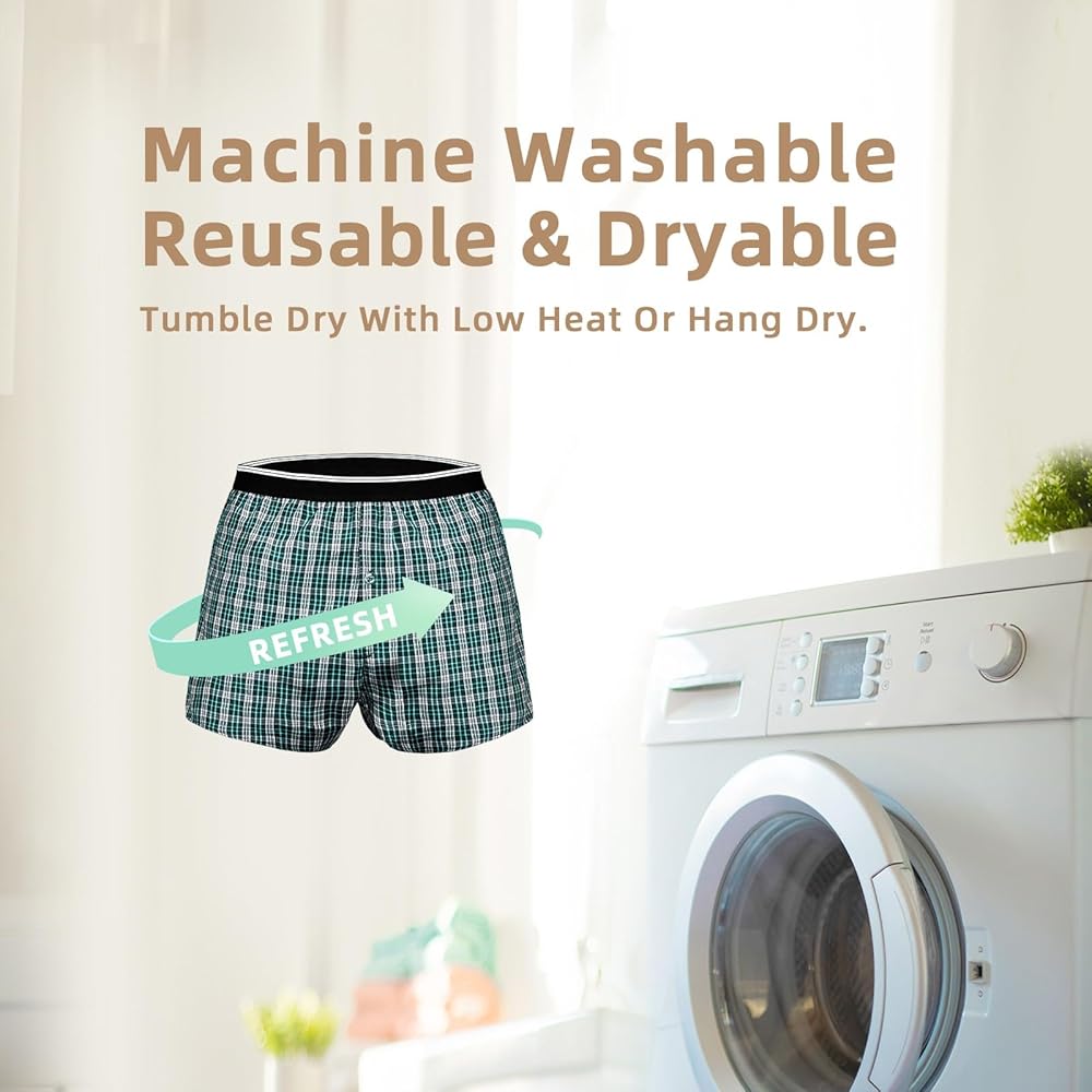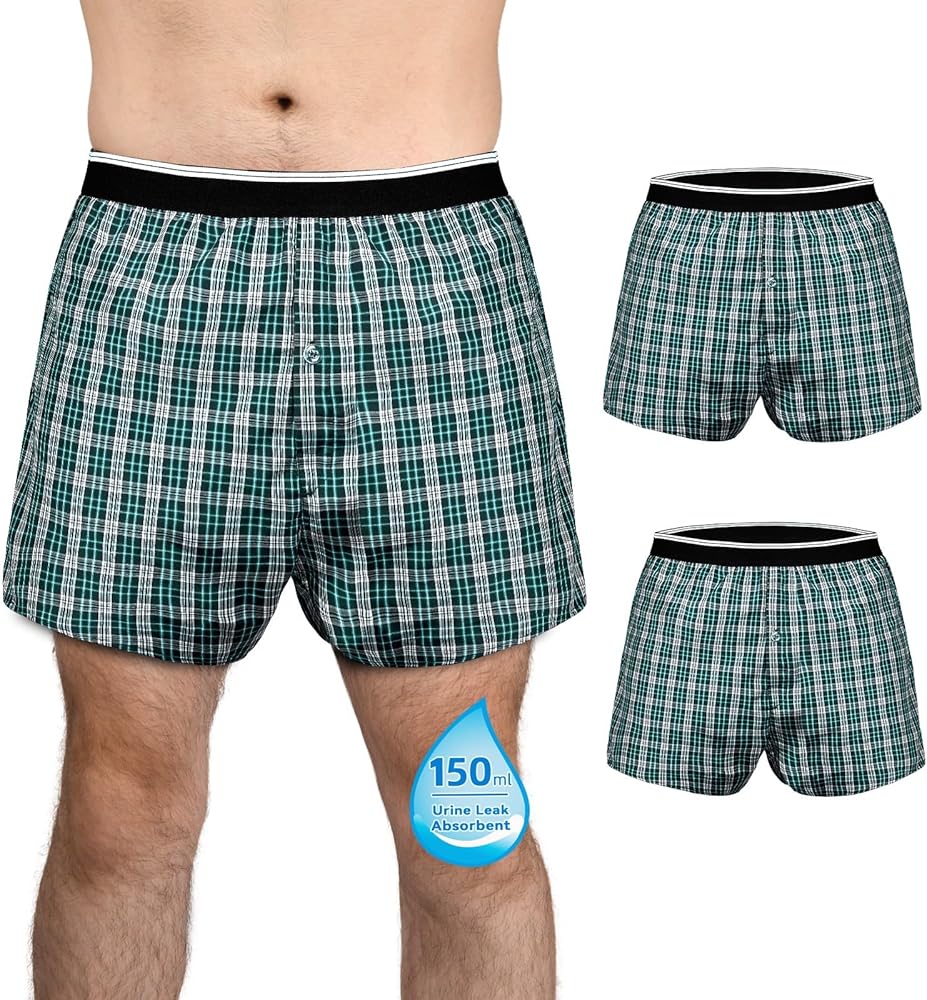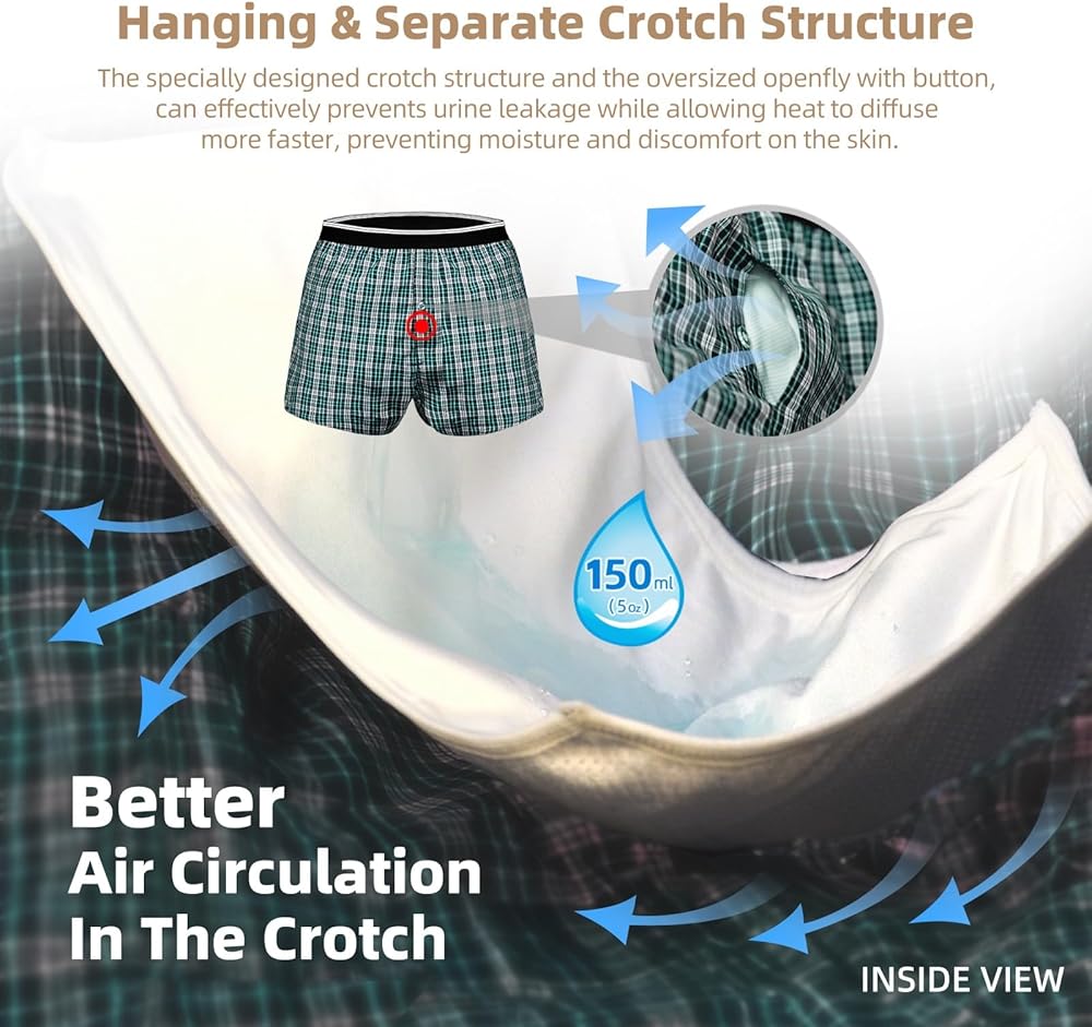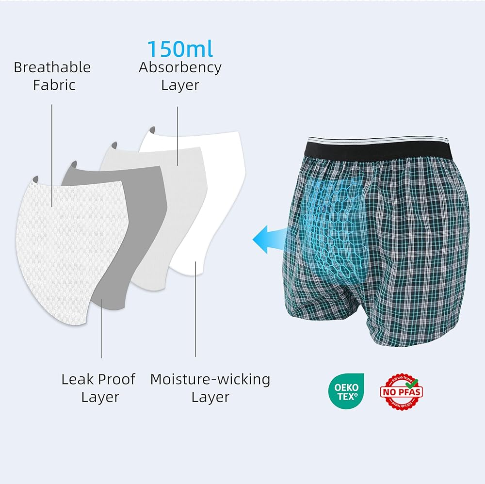 Special Design: These men's incontinence boxers feature a unique hanging separating structure of absorbent layers that extend for a larger guard lining. Unlike built-in briefs, this structure reduces friction and minimizes skin irritation, while also improving airflow for better hygiene. The protective underwear is reusable and machine washable for repeated wash