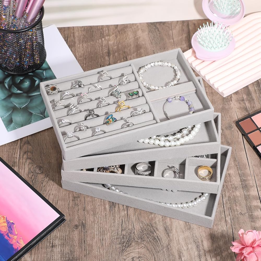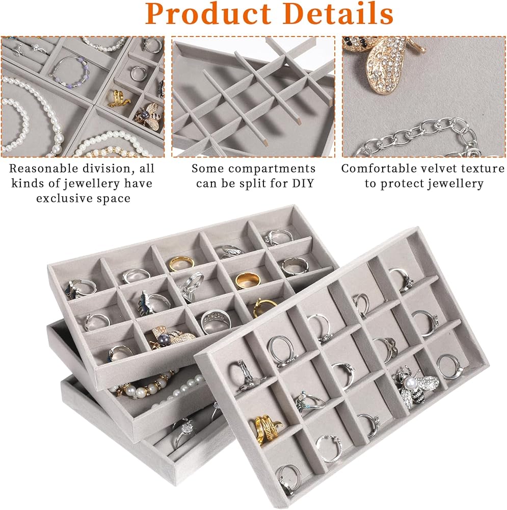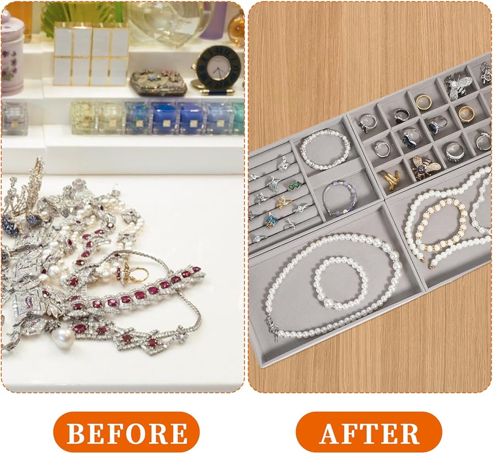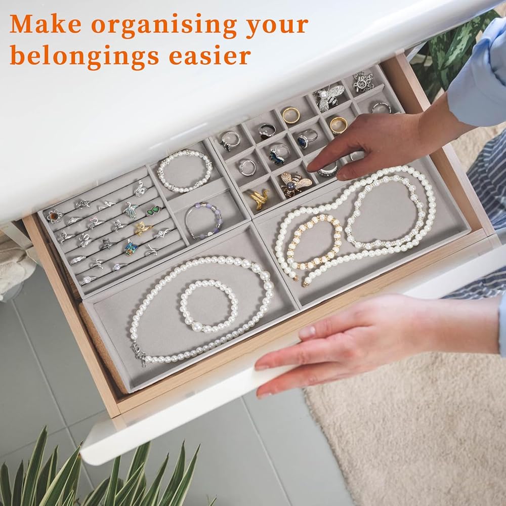 【Jewelry Drawer Organizer】: The stackable jewelry trays is completely covered with soft velvet for simplicity and practicality; the removable dividers of the two compartment trays help to adjust the grid size to accommodate various sizes of jewelry.