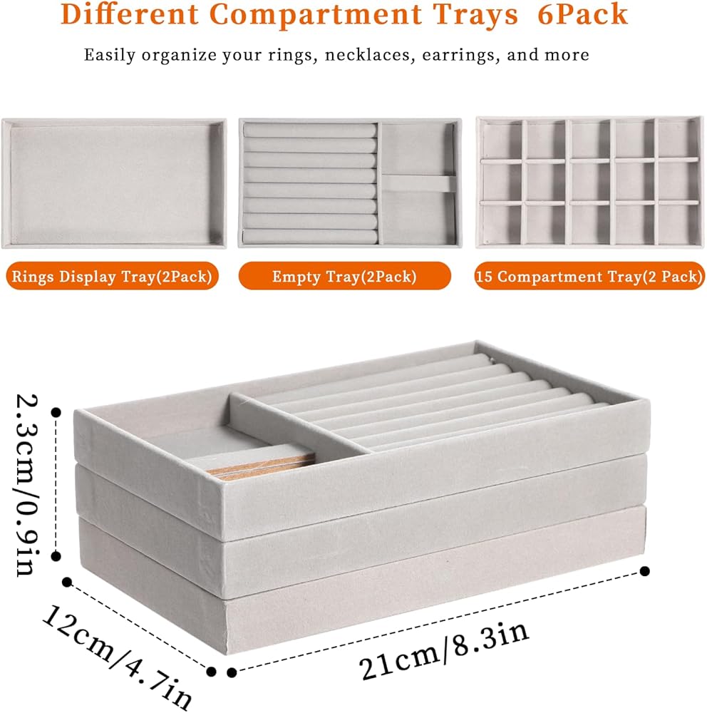 【6 Piece Set】: This set includes 6 stackable jewelry trays almost any type of jewelry: 2 pack with 24 compartments and ring displays for earrings and rings; 2 pack with 12 larger compartment trays for bracelets and watches; 2 pack of no-compartment trays with 10 hooks for necklaces