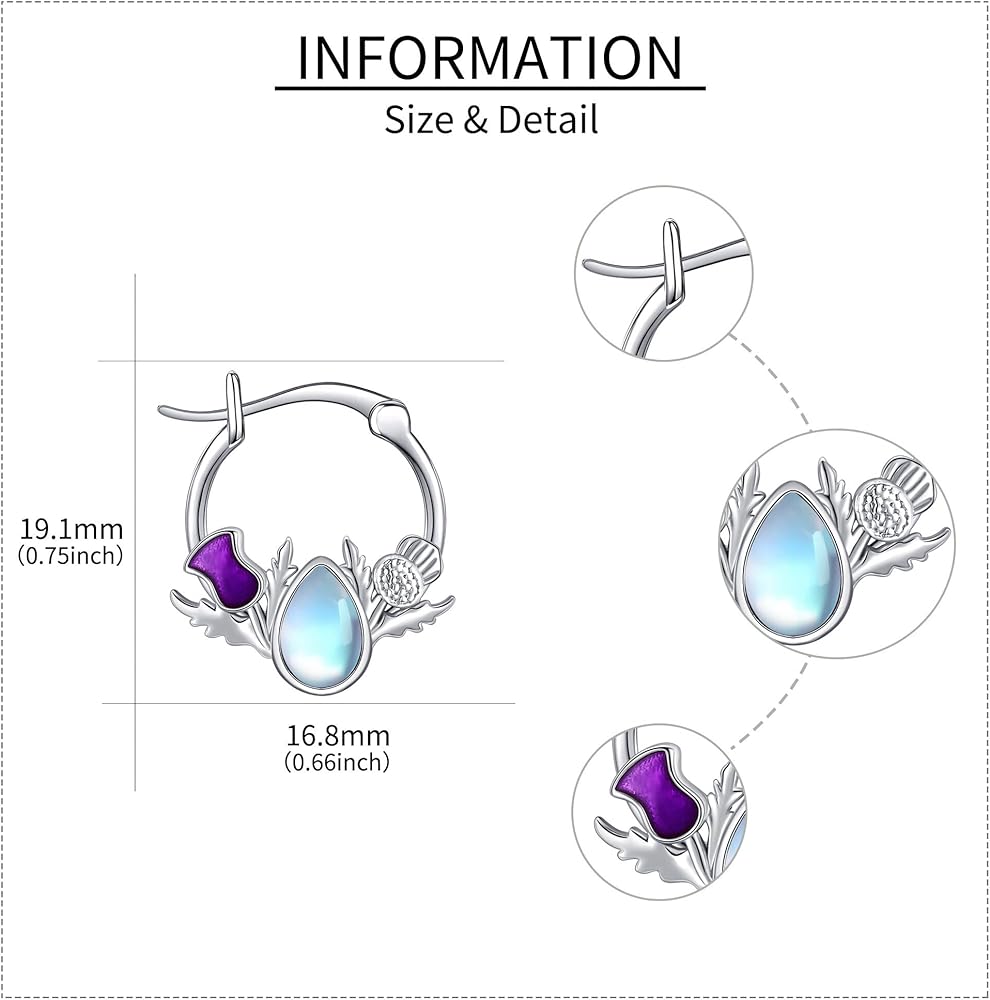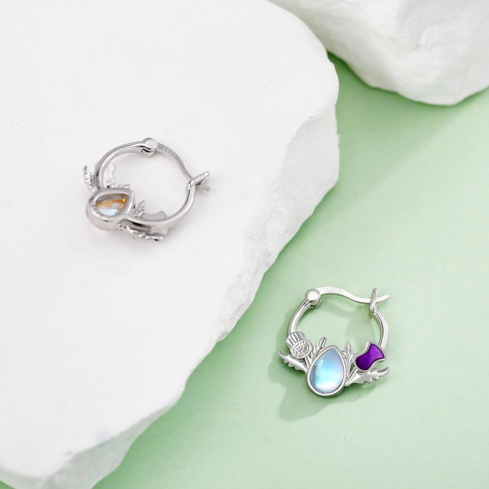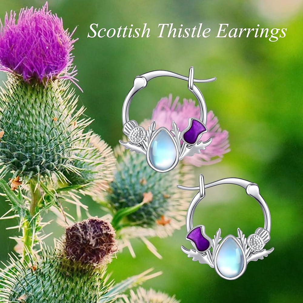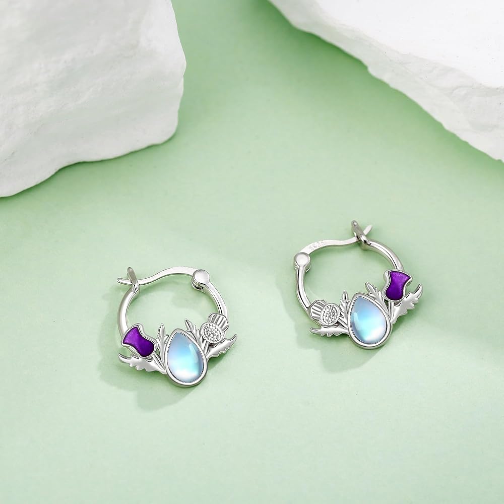 🌸925 Sterling Silver Scottish Thistle Earrings🌸Scottish Thistle Hoop Earrings are made of 925 sterling silver, and the Scottish Thistle are decorated with flowers and moonstones. Scottish Thistle are anti-allergic, anti-rust, anti-nickel, lead, and cadmium, Scottish Thistle Earrings are suitable for long-term wear, durable, and not affected by any allergic elements. Scottish Thistle Earrings come with a beautiful box and polishing cloth