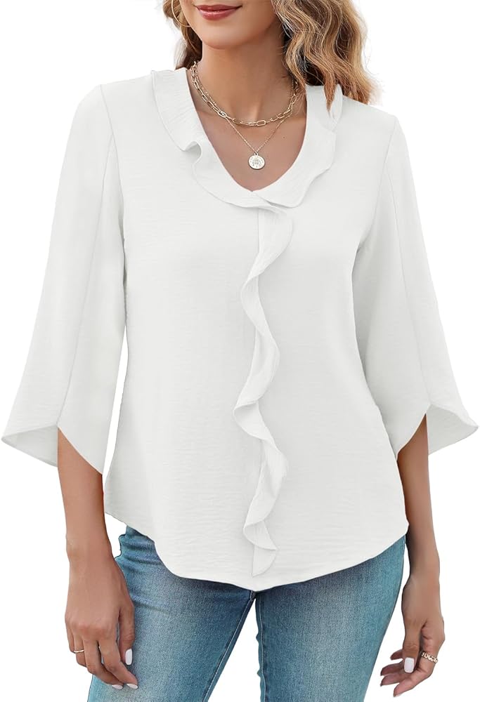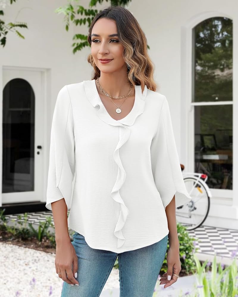 Elevate your wardrobe with this cute ruffle top! It features a short 3/4 sleeve, v neck, playful ruffle trim detail, curved hem, tunic length, solid color, flowy light fabric, and an ultra-flattering relaxed fit. The V-neckline adds a touch of femininity. Draped ruffles cascade from the neckline down the center front, adding a sweet touch to this 3/4 sleeve top.