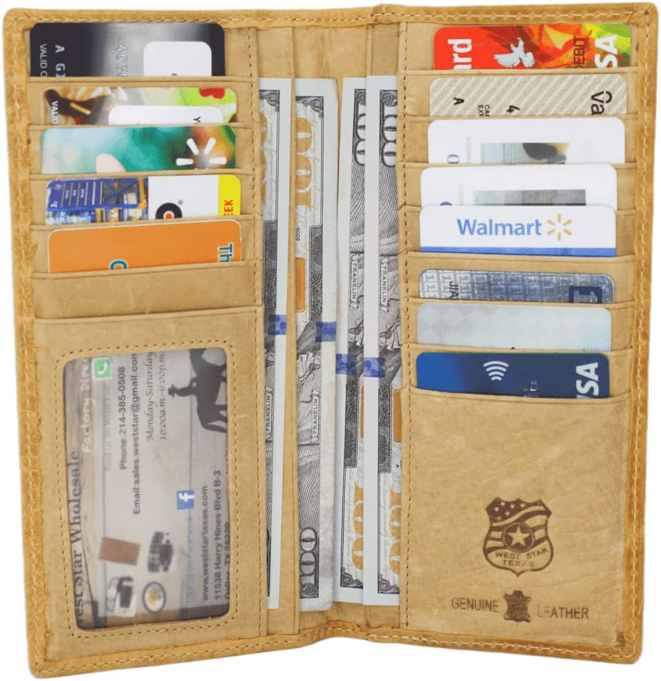 -Bi-fold closure. -Bi-Fold Closure and have natural special scratches with solid stitching and suited slots. -Measurements of the wallet-: 7"(L) x 3.50(W)" x 0.5"(D). -This western wallet is well designed with 13 credit card slots, 1 ID slot , 4 cash check pockets and Extra pocket on the back. -This wallet is made of of 100% Genuine Leather.