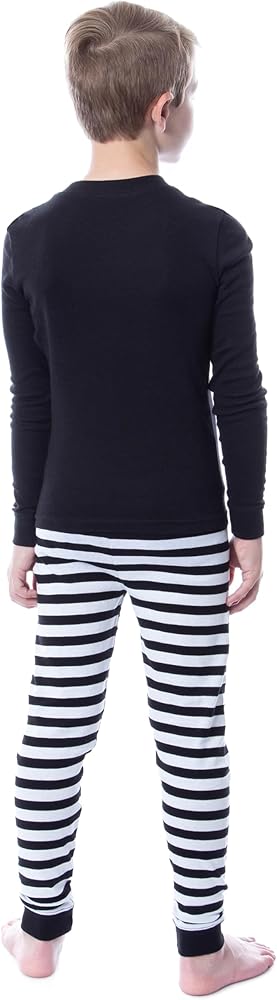 FUN SKULL AND GROUP LOGO - This awesome Matching Pajama Set features a Skull logo with the gang of kids design on a black long sleeve top, and the pants have a black and white stripe pattern. The pants have an elastic waistband, and the leg also has a stretch cuff for a snug fit at the ankles.