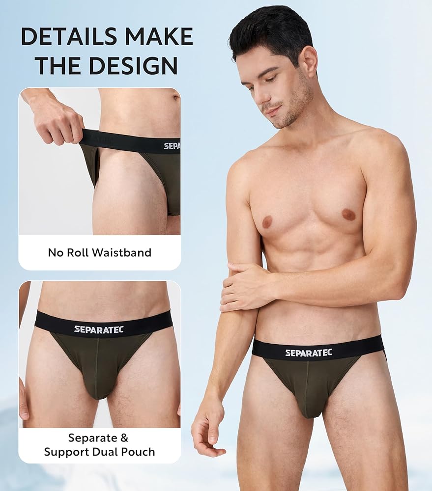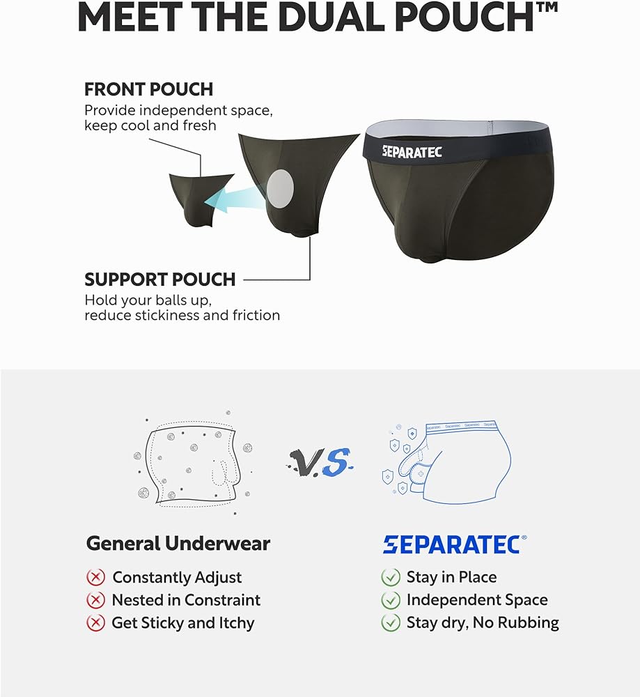 DUAL POUCH DESIGN: Putting the bikini underwear on you, put your member through a hole in the front and you boys on the inside, which is less sticking, and less adjustments throughout the day.