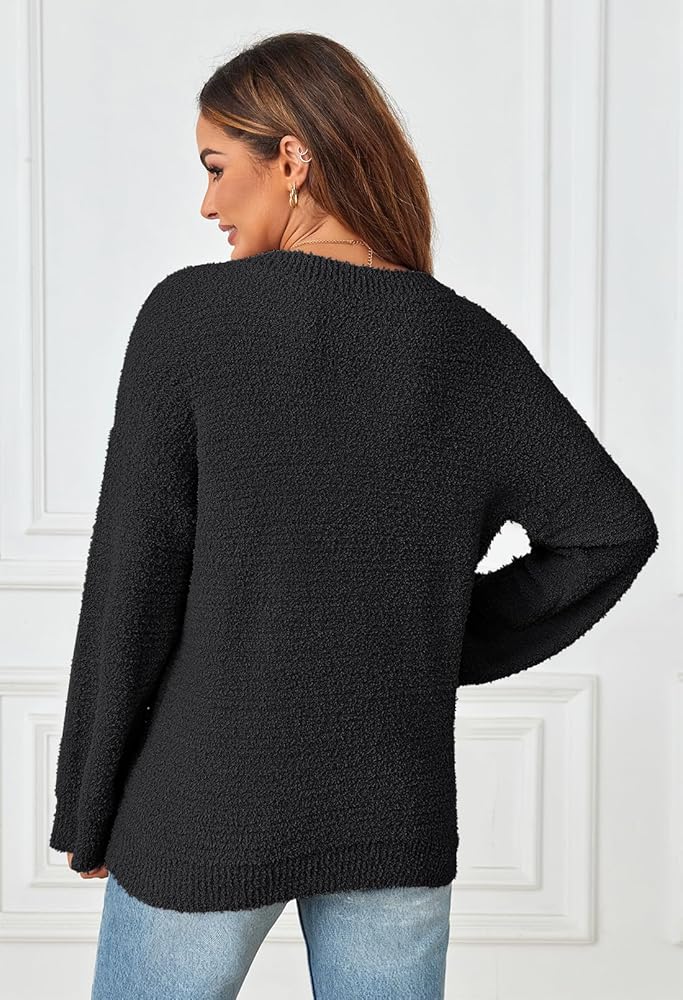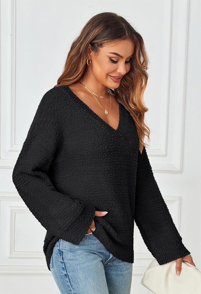 Features: V neck, long sleeve, drop shoulder, chunky knit, fuzzy fleece details, solid color, about hip length, loose fit, basic cut, sweaters for women trendy, cozy sweater for women fall.