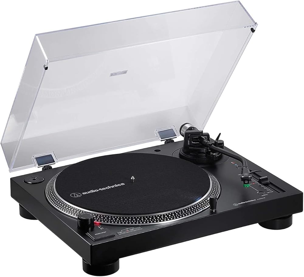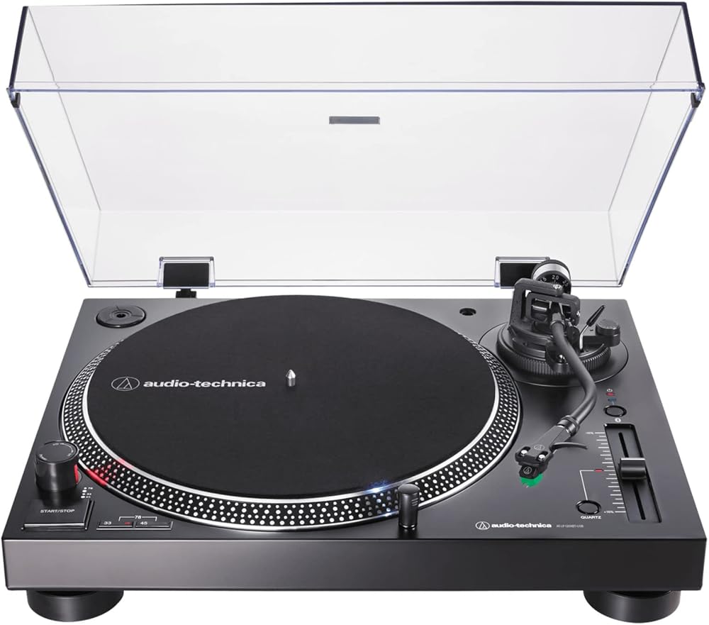 This fully manual turntable is modeled after the AT-LP120XUSB, but adds the convenience of Bluetooth wireless connectivity to the existing analog and USB outputs. Featuring a specially designed DC servo direct-drive motor and adjustable dynamic anti-skate control, the AT-LP120XBT-USB plays 33-1/3, 45, and 78 RPM records and outputs the high-fidelity audio to the device of your choice. Use the included RCA output cable along with the built-in selectable phono preamp to connect to your home stereo or powered speakers. Use the USB cable to connect to your computer (and then download the free Mac- and PC-compatible Audacity recording software, or software of your choice, to start converting your records to digital audio files). Or use the Bluetooth wireless technology to pair the turntable with wireless speakers, headphones or other devices, including those that support the high-quality Qualcomm aptX audio codec. The turntable also features an S-shaped tonearm with adjustable tracking force and an AT-HS6 universal ½"-mount headshell with an AT-VM95E Dual Magnet phono cartridge. Audio-Technica has been a leader in phono cartridge design for more than 50 years, and that expertise shows in the versatile, high-performance AT-VM95E cartridge, which comes with a 0.3 x 0.7 mil elliptical stylus, but is also compatible with any VM95 Series replacement stylus, offering a wide choice of options for every budget and application. Additional professional features include a die-cast aluminum platter with felt mat; a start/stop button; selectable high-accuracy quartz-controlled pitch lock and pitch change slider control with +/-10% adjustment range; a stroboscopic platter with speed indicator; a removable plug-type stylus target light; external power supply; and a removable hinged dust cover.