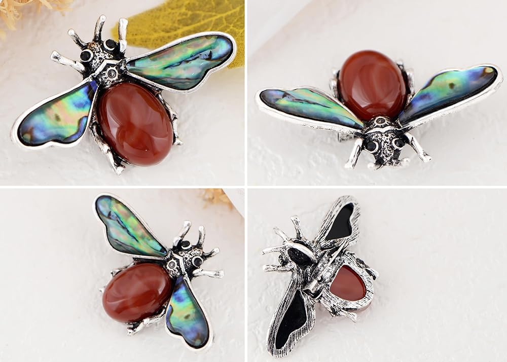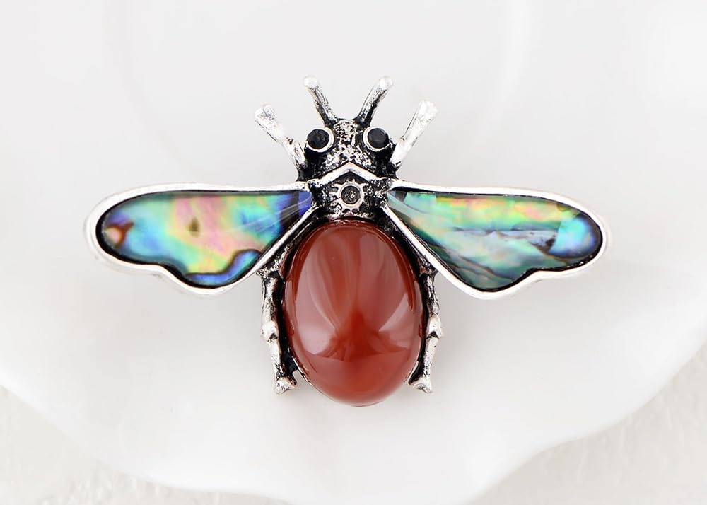 Vintage inspired design. this antique silvery tone brooch features a honey bee insect design, adorned with abalone shell stone accents for a timeless, elegant look.