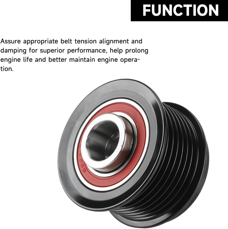 Function - The Idler pulley is to adjust the tightness of the belt, making the transmission system running smoothly and effectively and ensures proper belt tension, alignment, and damping for superior performance. After long term use of the drive belt tensioner, cracking, aging and rust of the Idler pulley will occur. When an original belt is slipping, broken or worn from fatigue, replace idler pulley directly to ensure your vehicle performs with optimum levels of safety.