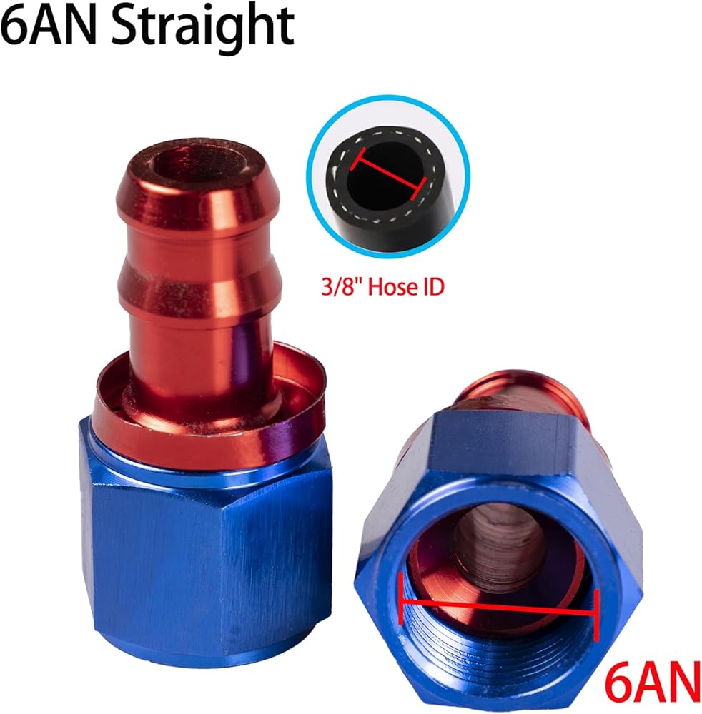 100% Brand NewBrand Name:NihfienMaterial:lightweight 6061-T6 aluminumSize:6 AN to 3/8PackageInclude:2xStraight Push-on Hose End FittingsColor:Blue and Red Angle: StraightApplication:The push-lock fitting is widely used in brake systems, air and fuel delivery,engine modification,cooling systems etc,suitable for brake fluid,fuel oil,engine oil,water,etc.only be worked with rubber fuel line,It can not be installed on PTFE Hose, Nylon Braided Hose,or Stainless Steel Braided Hose.Installation:Easy to install,no special equipment required,We normally recommend a bit of assembly lube to push the hose onto the nipple.this push-lock fitting reusable and recycling,the fitting precisely processed makes fitting worked last for long.Characteristics:Unique one-piece design with weld-free fitting that gives better fluid flow and integrity over the normal brazed together hose ends fittingInstallation Suggestion:the AN is the uniform standards,but different outer diameter of the fittings from different factories,the adjustable AN wrench is highly recommended is not recommended to use iron or stainless steel wrenches to damage the fitting.