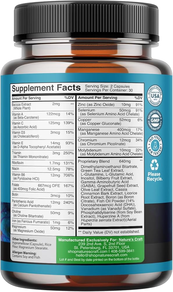 Nootropic Brain Supplement for Memory and Focus Support - Vitamins for Mental Support & Clarity with Bacopa Monnieri, VIT A, B6, Riboflavin, Niacin, Thiamin & Folate - Cognitive Complex - 60 Count