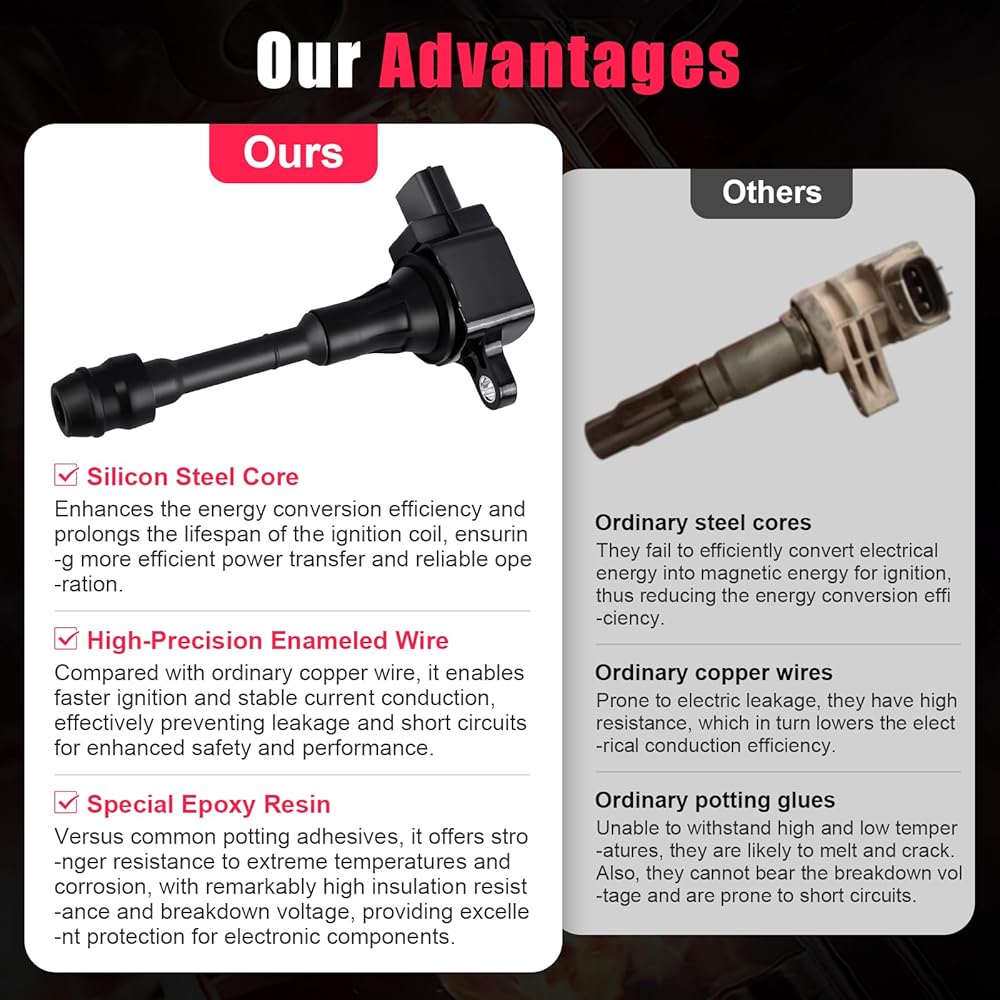 【Uncompromising Quality Assurance】: Our Coil Packs go above and beyond OEM standards Every Ignition Coil Pack undergoes a rigorous inspection process. From meticulous visual checks to comprehensive electrical performance tests and high-pressure assessments, each Coil Pack is subjected to stringent scrutiny. Each Coil Pack is thoroughly examined to ensure impeccable quality and reliability.