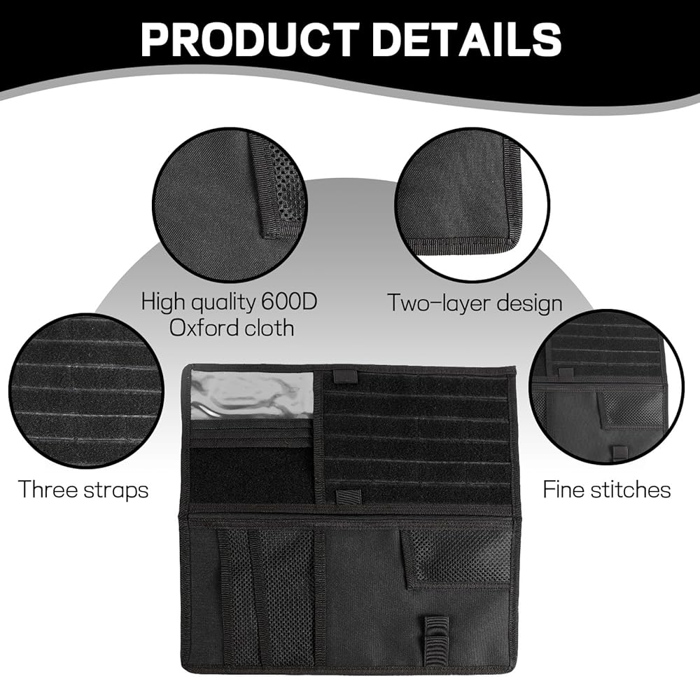 【Double-sided Design】: It features a one-piece design with multiple pockets and elastic loops, as well as a looped panel for displaying morale patches or name tags. The front side can hold tactical gear such as pens, safety hammers, flashlights and seatbelt cutters, and the back side can hold cards, receipts and documents.