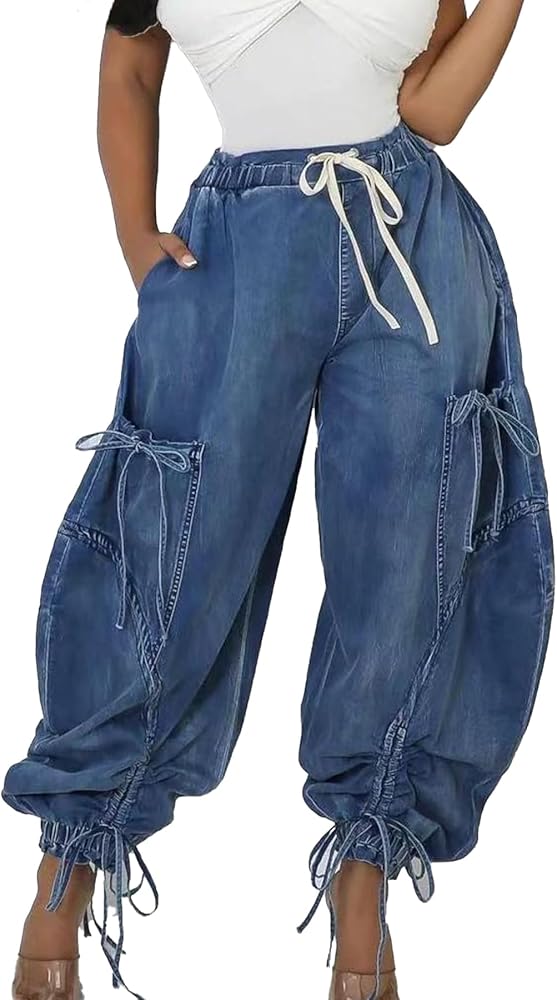 Baggy jeans for woman highlights:This women's cargo jeans are inspired by y2k style,featuring an elastic waist,bow accents,large pockets,and pull-on design for a fashionable and practical look