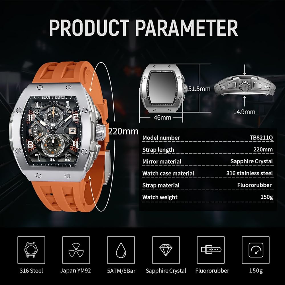 ⌚If you are looking for a watch that shows luxurious personality, the TSAR BOMBA men's watch can meet your needs. The shape of the wine barrel discards the unchangeable traditional design and is also favored by many luxury brands. Wearing this watch will make you different, you may have to get used to being asked a lot or throwing envious glances. Enjoy this feeling, life will becomes more interesting and you will become more attractive.